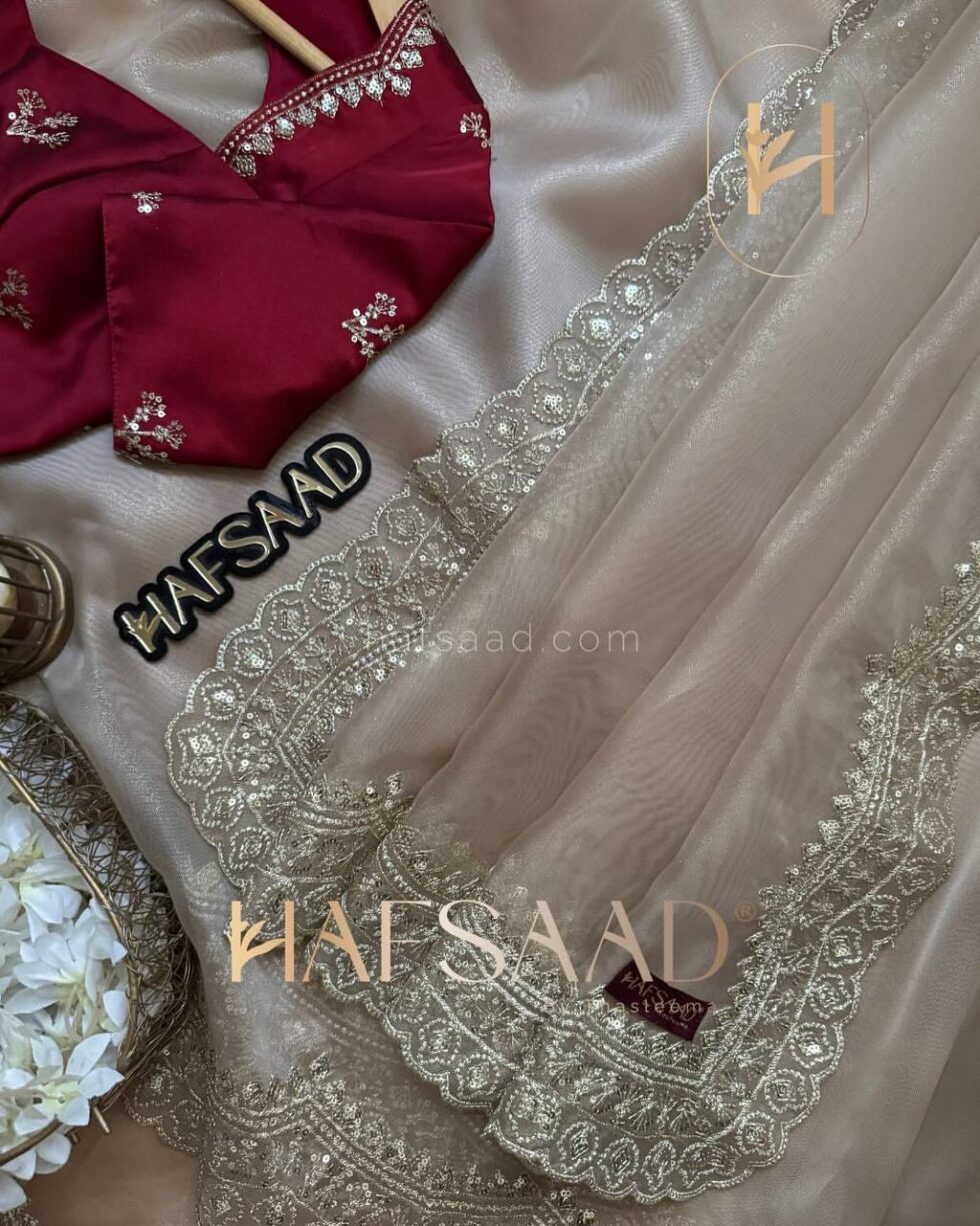 Presenting an exclusive designer creation from Nice Creation, Design No. NC – 5441. This stunning saree is crafted from Heavy Soft Nylon Organza, offering a graceful drape. It features intricate sequins and Zari embroidery work throughout, creating a dazzling effect. The ensemble is completed with a matching blouse in Soft Satin, adorned with coordinating Zari and sequins embroidery. This exquisite and radiant saree is available for βΉ4,698.00, perfect for making a statement.